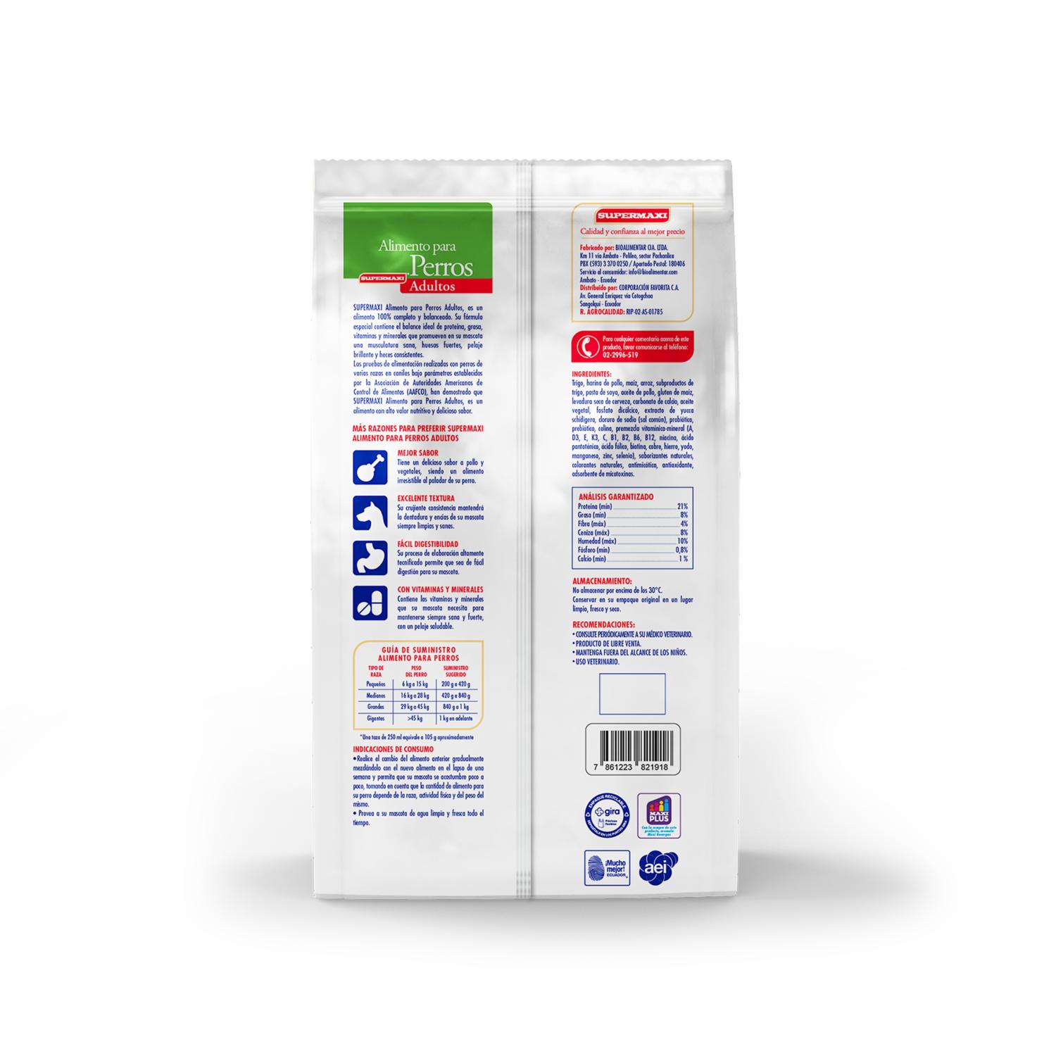 Tu compañero fiel se merece lo mejor. Este alimento para perro adulto sabor a pollo de SUPERMAXI ofrece una nutrición balanceada que cuida su energía, salud y vitalidad. Con un sabor irresistible y croquetas fáciles de digerir, es ideal para mantener a tu perro feliz y saludable cada día. Presentación práctica de 4 kg para mayor duración