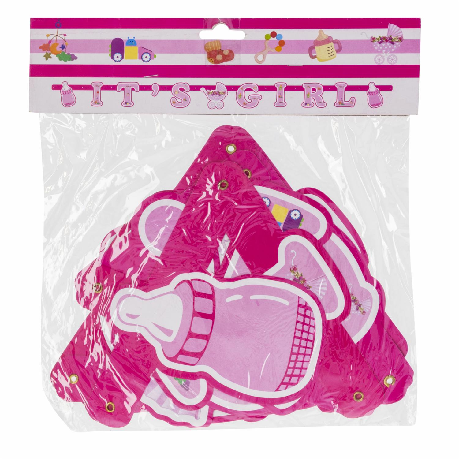 Celebra la llegada de una princesa con esta guirnalda «It?s a Girl» en tono rosado, perfecta para decorar con ternura y alegría tu fiesta de bienvenida