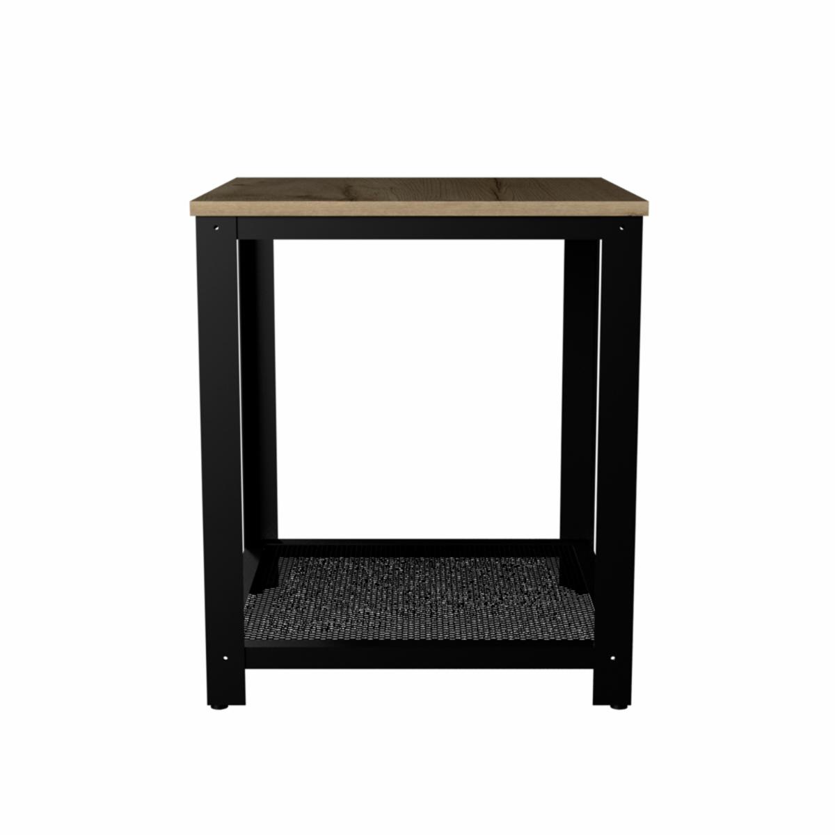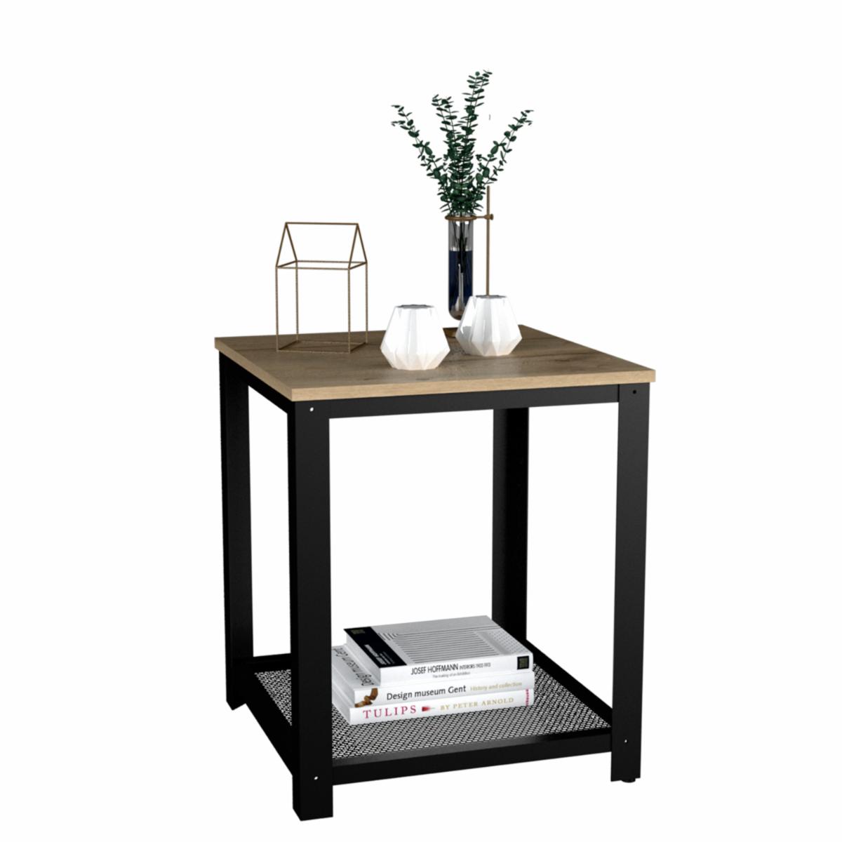 Mesa Esquinera Auxiliar Con Estructura Metálica. Su Diseño Es Moderno. Tiene Entrepaño Inferior Con Malla Metálica. Elaborado En Madera Aglomerada Mdp, Recubierta Con Láminas Melamínicas De Excelente Calidad, En Color Café Claro